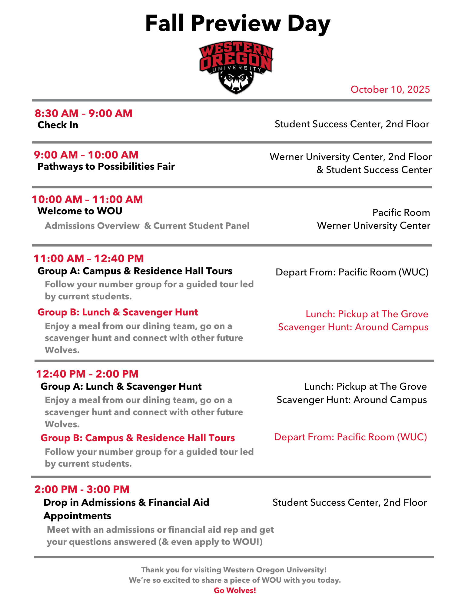 Tour our campus and residence halls, meet current students, and connect with future Wolves just like you! Explore academic programs and student support services at our Pathways to Possibilities Fair, get help applying on the spot, and learn how WOU sets you up for success — from scholarships to student life. Bring your family, your questions, and your excitement — we’ll take care of the rest!